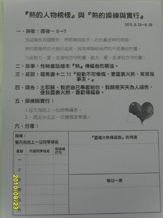 已過七月三十一至八月一日在台中縣霧峰鄉亞洲大學舉辦『二○一○年暑期中市縣親子健康生活園』,主題是『親、熱、就』。計有一百一十一位學齡家長、一百四十一位學齡兒童、十四幼幼的家長、二十一位幼兒赴會,加上四十二位大專隊輔與十二位青職聖徒一同服事,共計350人。這次親子健康生活園仍是在許多家長、大專和青職的配搭下,一同盡功用。雖然過程中倍感辛苦,但許多家長藉著課程的預備受益良多,大專和青職聖徒在實際的服事中度量被擴大。當我們來到主面前禱告時,裡面有一種確信,這是主所要的,祂乃是要得著一個個活力家來完成祂的定旨。以下是園地剪影: